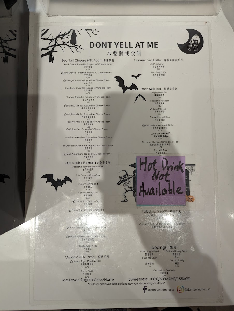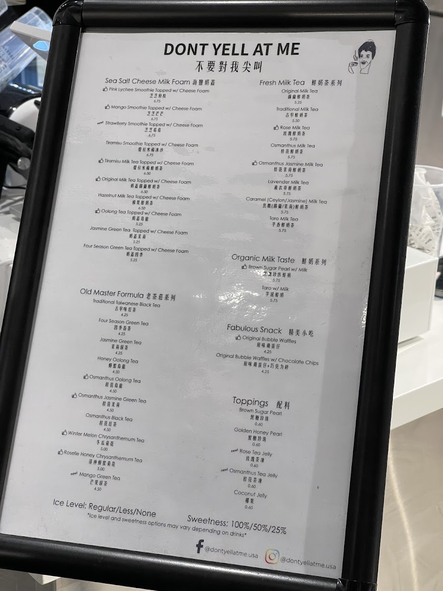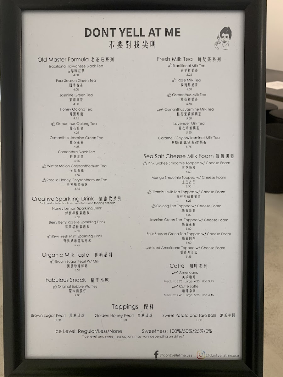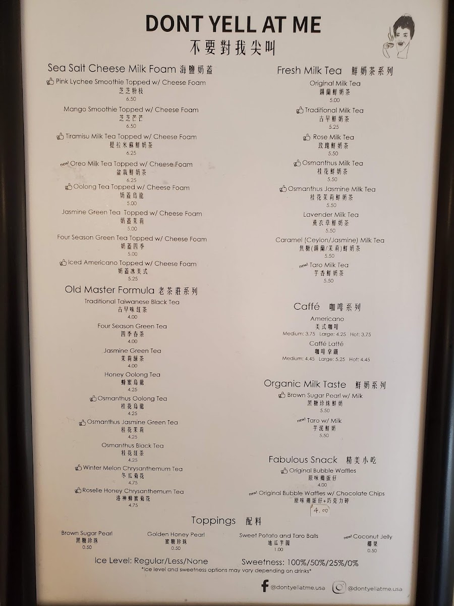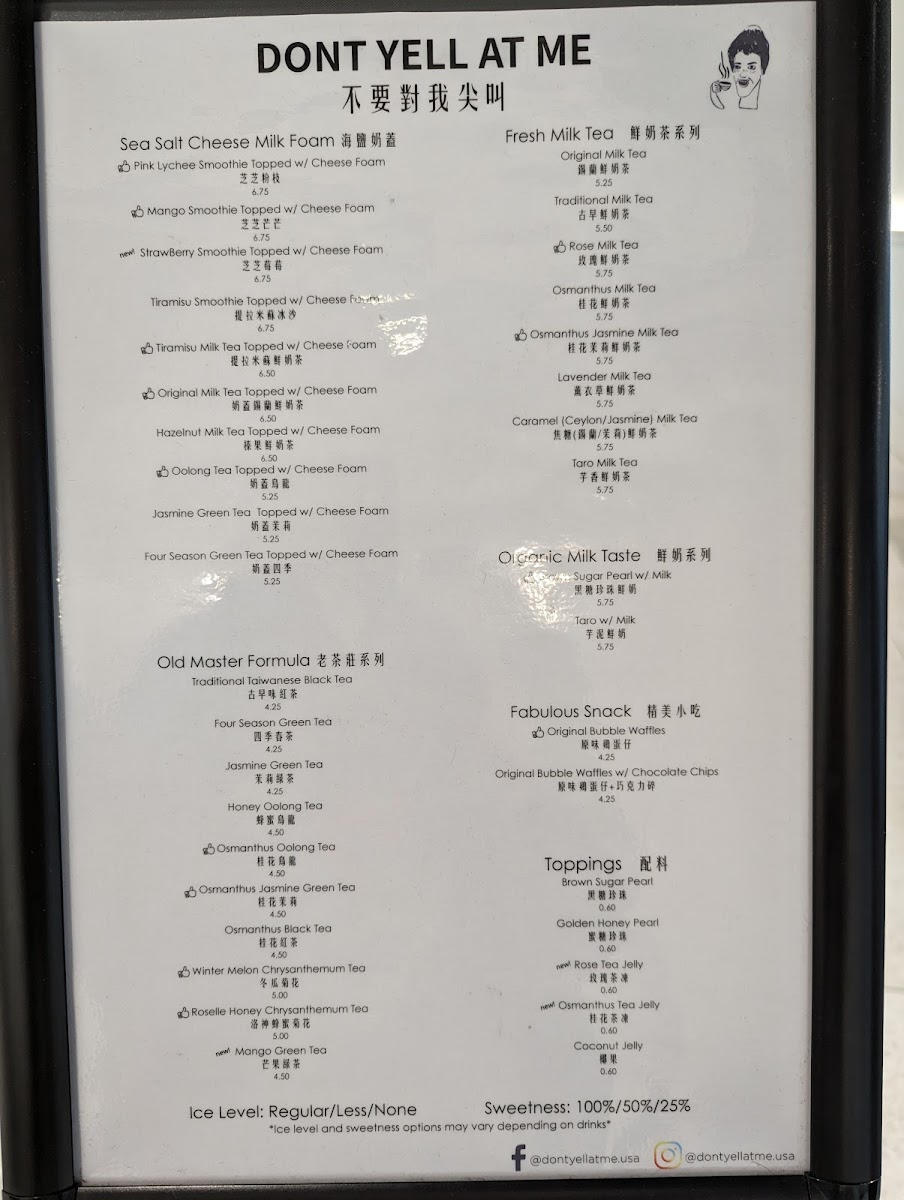 The menu at Dont Yell At Me primarily features a variety of bubble tea beverages with options that cater to diverse tastes. The offerings are organized into several categories, including specialty milk teas, cheese foam-topped teas, traditional Taiwanese teas, and organic milk-based drinks.